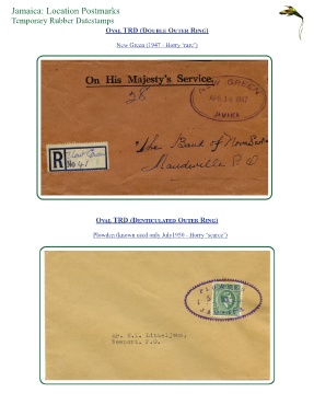 Jamaica: Location Postmarks Temporary Rubber Datestamps Oval TRD (Double Outer Ring) New Green (1947 - Horry ‘rare’) Oval TRD (Denticulated Outer Ring) Plowden (known used only July1950 - Horry ‘scarce’)