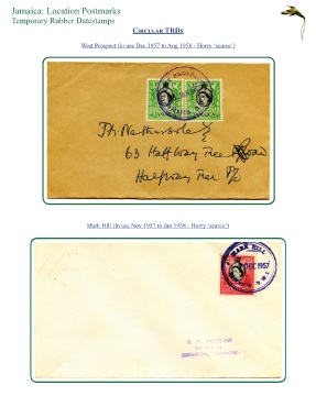 Jamaica: Location Postmarks Temporary Rubber Datestamps Circular TRDs West Prospect (in use Dec 1957 to Aug 1958 - Horry ‘scarce’) Mark Hill (in use Nov 1957 to Jan 1958 - Horry ‘scarce’)