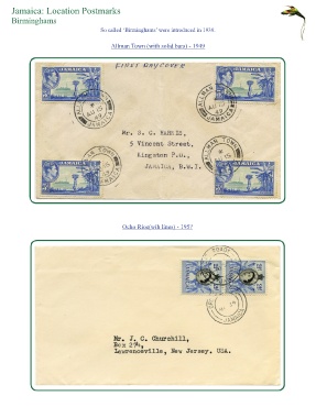 Jamaica: Location Postmarks Birminghams So called ‘Birminghams’ were introduced in 1939. Allman Town (with solid bars) - 1949 Ocho Rios(wih lines) - 195?