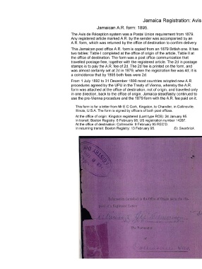 This Jamaican post office A.R. form is copied from an 1879 British one. It has