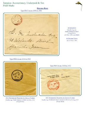 Double ring ‘PAID JAMAICA’ PD18 of 2 Dec 1911 Double ring ‘POSTAGE PAID JAMAICA’ PD189 of 24 Aug 1937