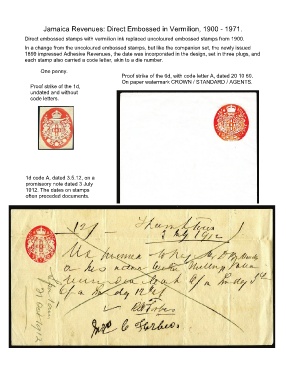 Jamaica Revenues: Direct Embossed in Vermilion, 1900 - 1971.