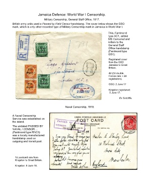 mark, which is only other recorded type of Military Censorship mark in Jamaica in World War I.